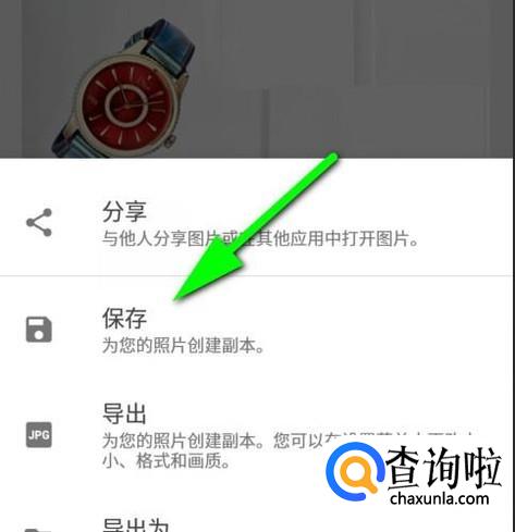 接下来,我们点击界面的右下角这里的“导出”,弹出列表中,手指轻点一下“保存”,把制作好的照片保存到手机相册中。