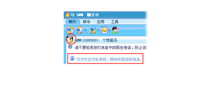 当用户使用“Q我吧”状态时,头像右下角会出现一个笑脸图标,表示用户希望有人同其聊天。
