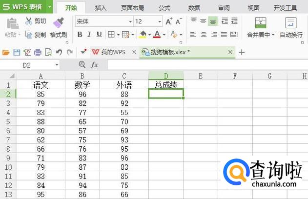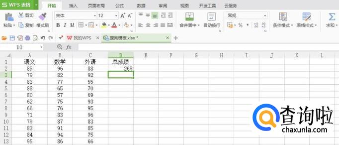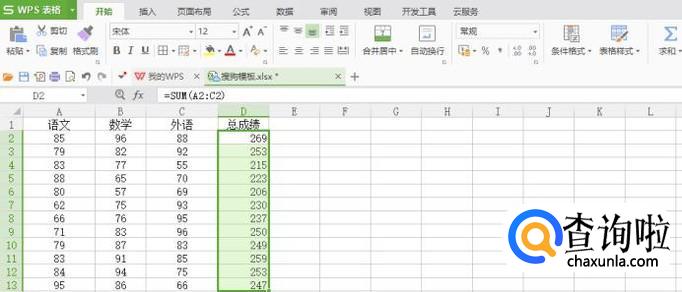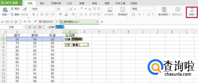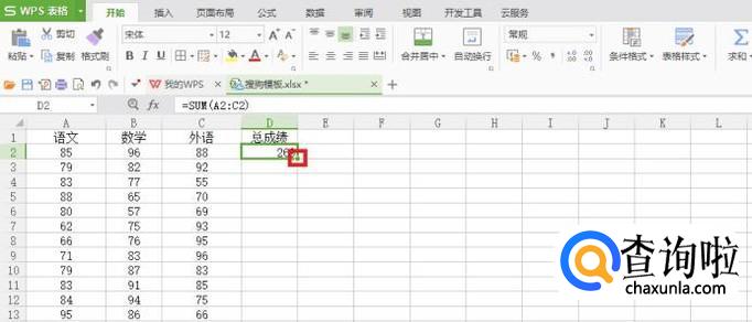 给第一行数据进行求和,单击D2单元格,在菜单栏公式下面选择自动求和,回车