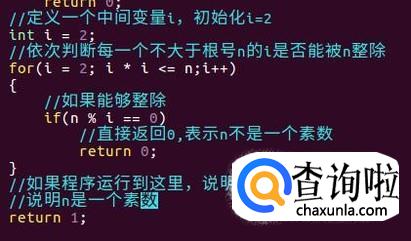 然后定义中间的因数i,初始值为2。依次使n对i取余数,看n能否整除i,然后令i自增直到i的平方大于n。在这过程中,如果遇到n能整除i,则说明n不是一个素数。如果循环能够直到i的平方大于n才结束,说明n是一个素数。