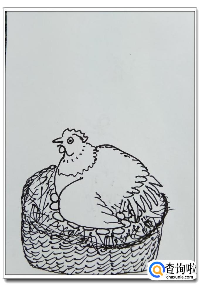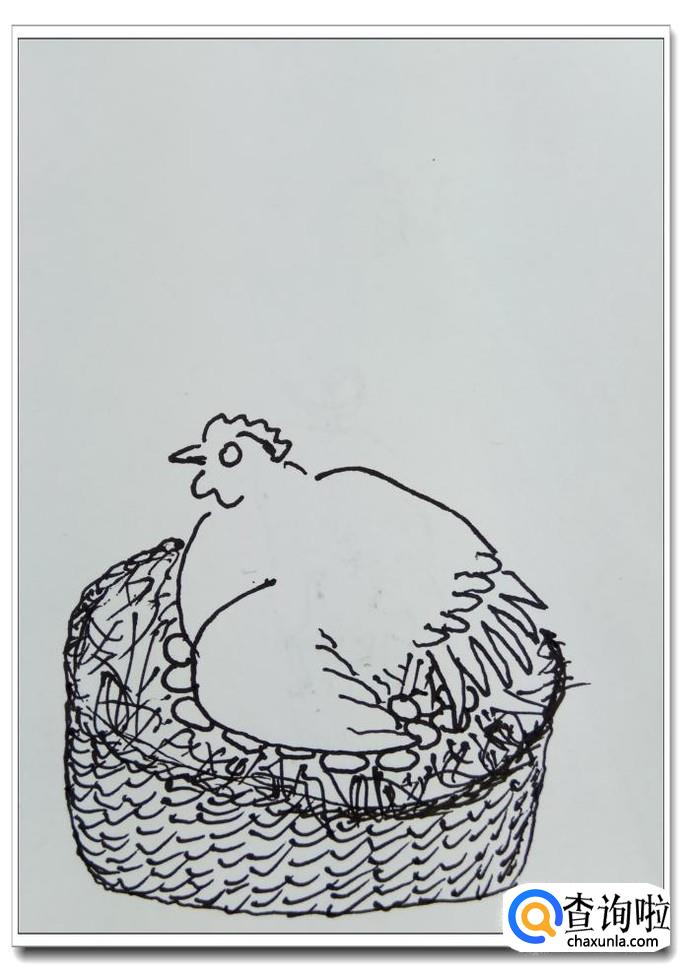 用一些小的弧线画出母鸡窝篮子的质地,这是一种农村里常用的用枝条编制的筐子。