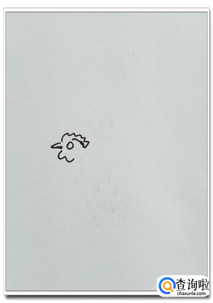在白纸上画一个圆圈,画出鸡的眼睛,然后用曲线画出鸡的头部和尖尖的嘴巴,然后再用波浪线画出母鸡的鸡冠。