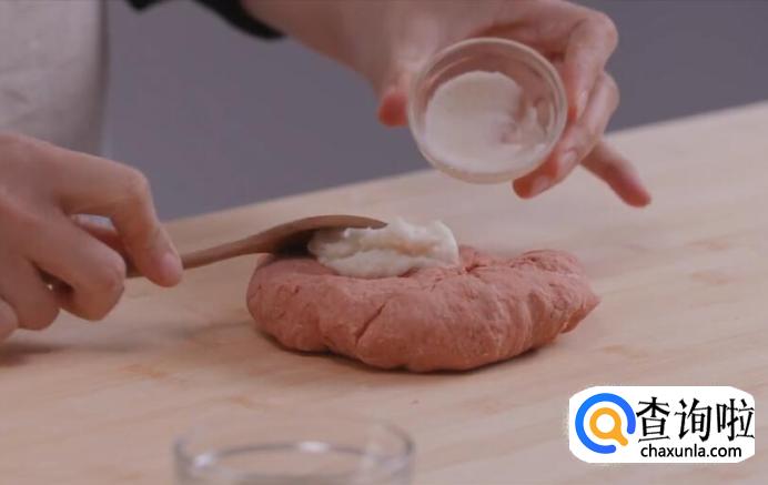 再加入猪油,蒜蓉、黑芝麻继续揉搓,直至面团质地光滑。
