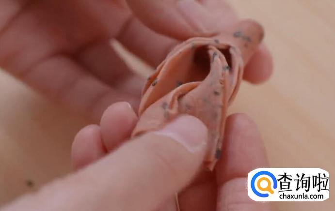 将面片的一头穿过缝隙,拉出,反转成型。