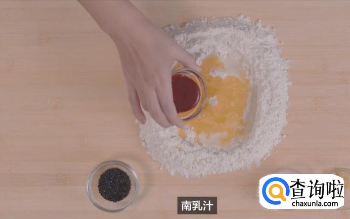 在面粉上挖个洞,加入适量的水、蛋液、南乳汁,揉搓成团。