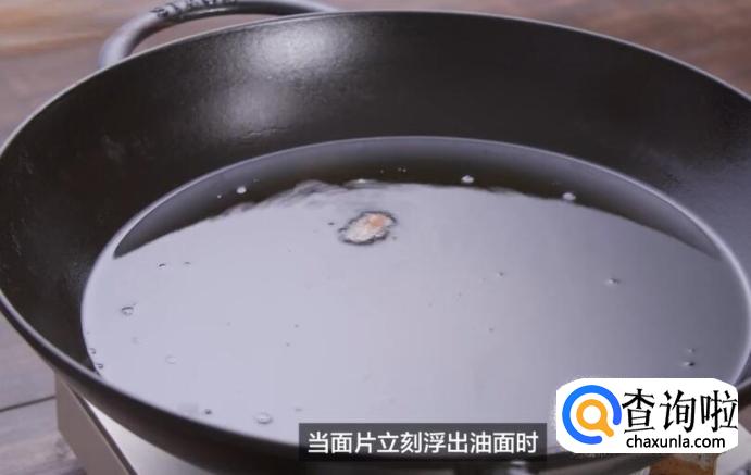 起油锅,投入一个面片测油温,当面片立刻浮出油面时,温度就差不多了。