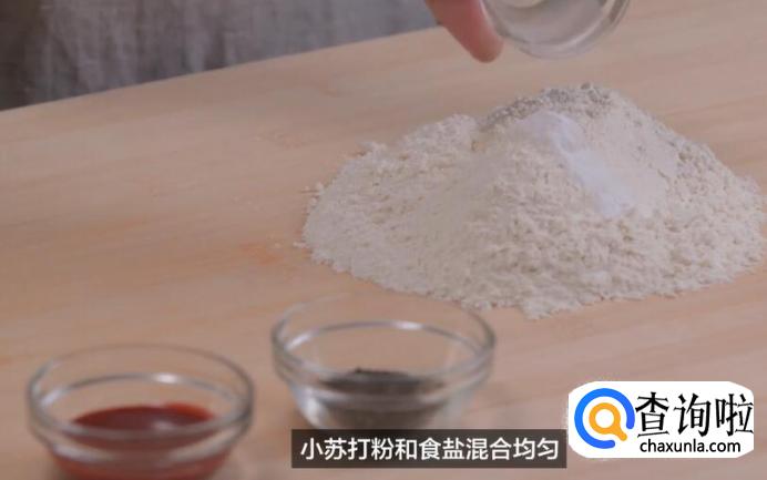 首先揉制面团,将面粉、小苏打粉和食盐混合均匀。