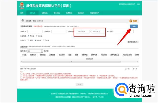 点击左上角的“发票勾选”选项,会出现下面的界面,我们填好开票的日期,填好后选择“查询”选项。