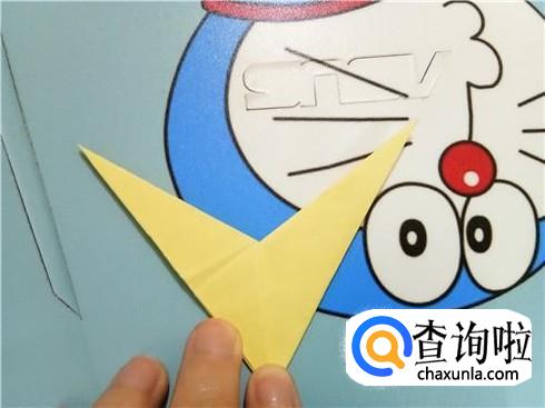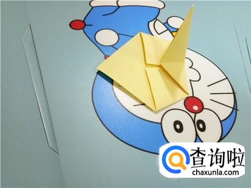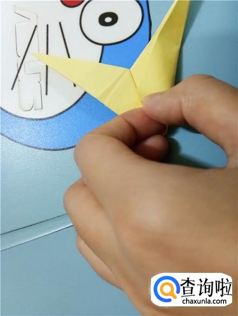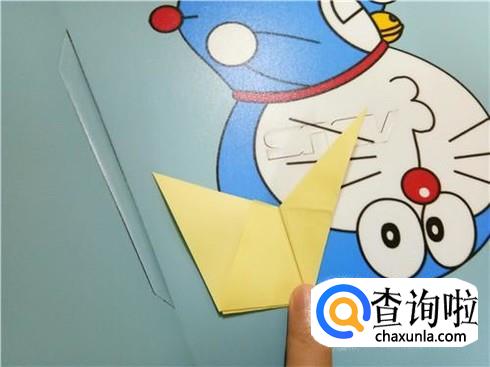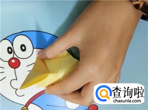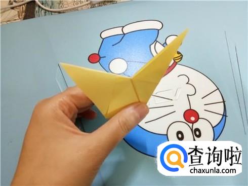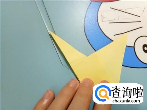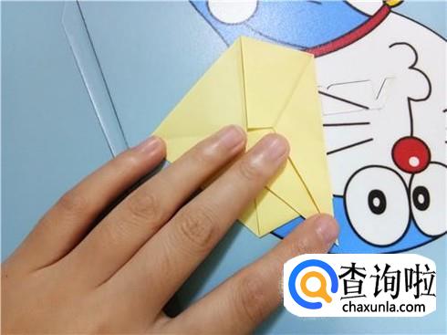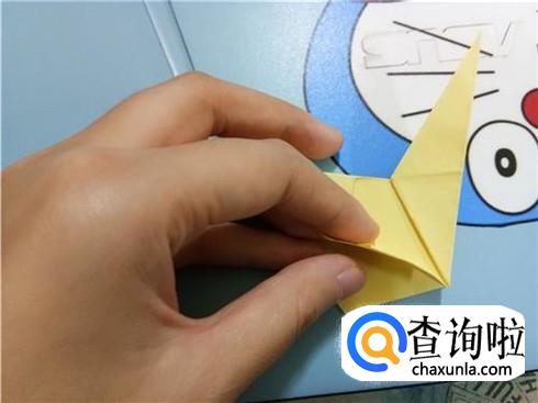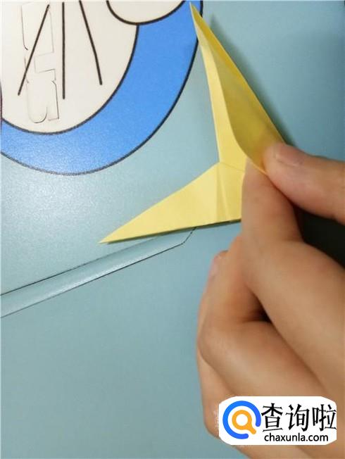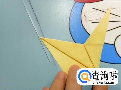 最后,将上边的这一层沿着它最尖的角折叠一下并且将它放到右边竖起的尖角的下边。我们翻到另一面以后,重复一下刚才的步骤,一个V形的飞镖就折好了。
