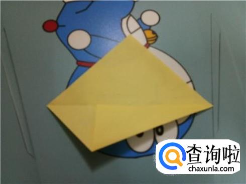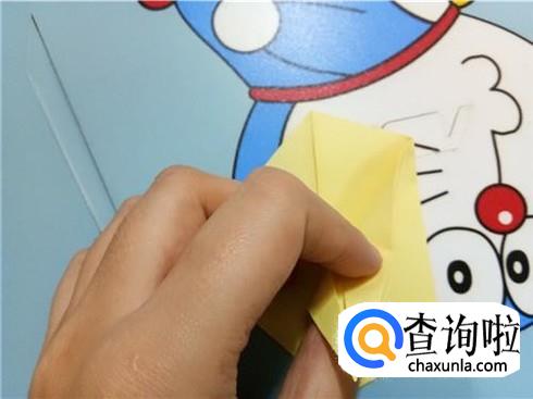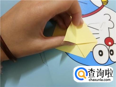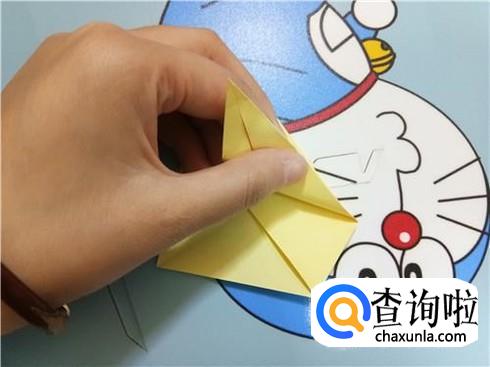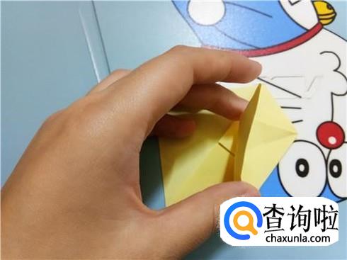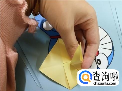 我们按照刚才折叠出的一些线路轻轻的将两边压下去,并且整理一下,这样就会形成一个竖起的尖角。