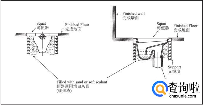 蹲便器的排污口和落水管的预留口均涂上粘结剂或胶泥,将蹲便器的排污口与落水管预留口接驳好,校正蹲便器位置。砌砖固定蹲便器,要预留填碎石土的缺口。