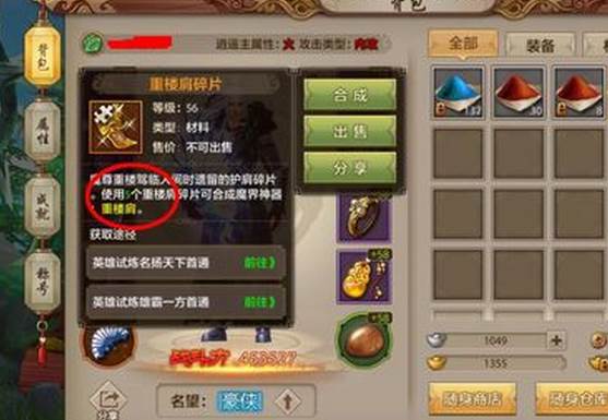 重楼肩可以在英雄试炼高层中获取,大约130层左右。重楼肩最低估计要48-50W战力,482500是最低标准,到了这分就能过。