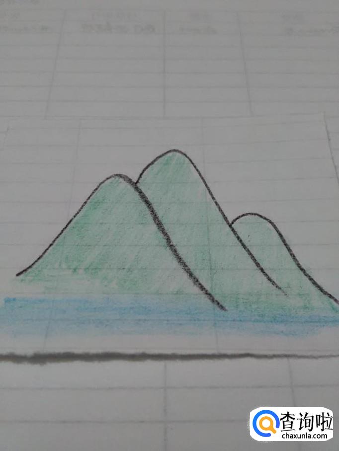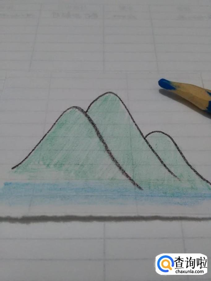 再用浅蓝色笔在大山下面画一条浅蓝色的区域,表示水面,大山就画完了。