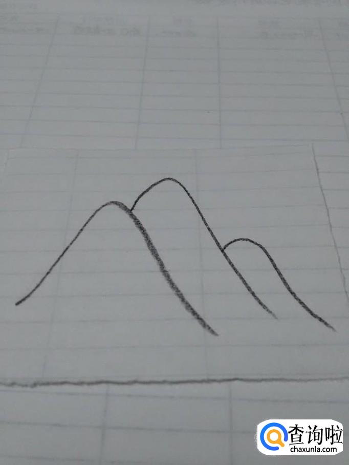 在山的右侧,再画两条曲线,表示后面的山峰。