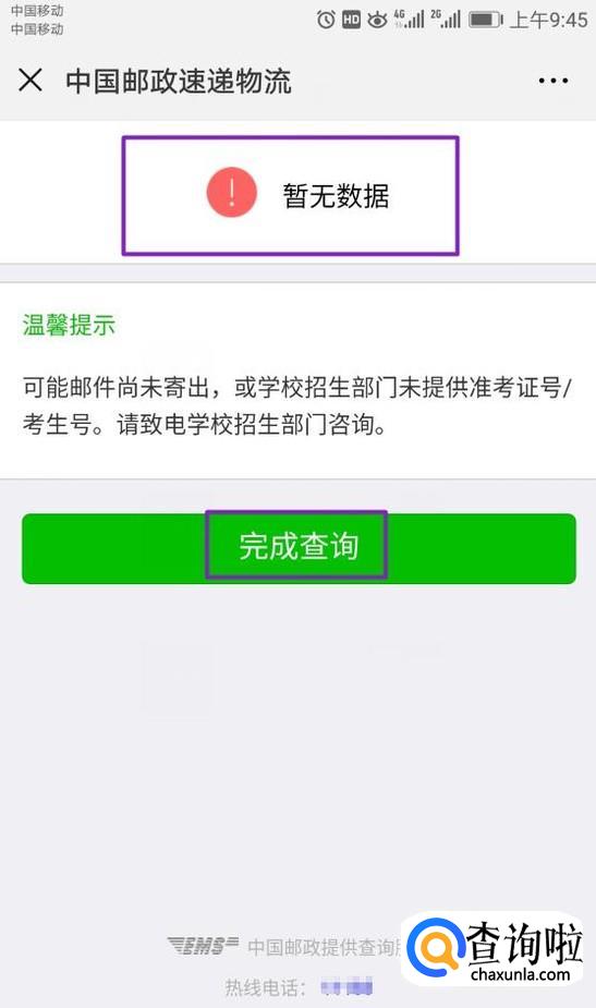 查询结果如图所示,目前暂无数据,我们点击完成查询。可能是暂时还没寄出来,我们可以过一段时间再继续查询,相信大家现在都会用微信查高考通知书的物流状态了。
