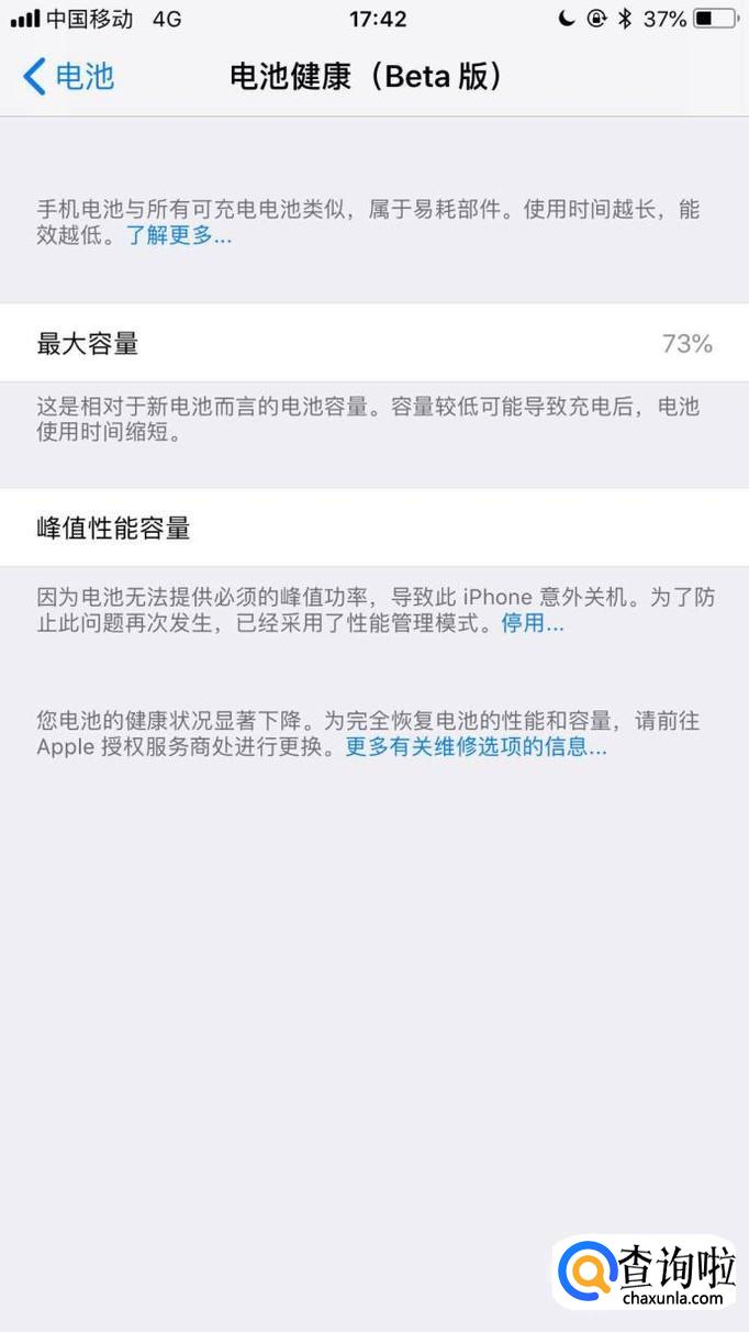 在这个界面,我们可以查看到我们电池的目前最大容量以及峰值性能容量等情况。