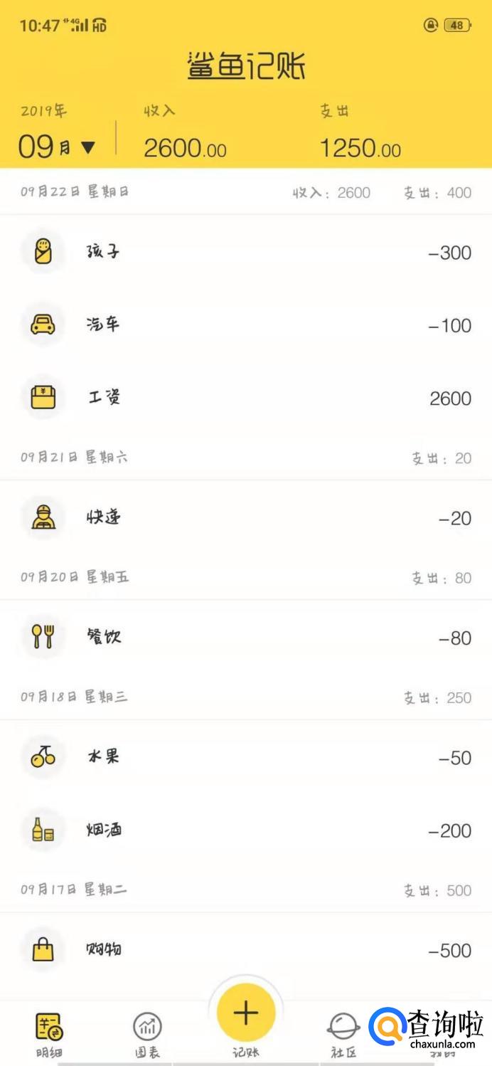 第一款鲨鱼记账软件,是我觉得比较好用的一款记账软件,明细的左边是收入,右边是支出,每天都有合计支出了多少。