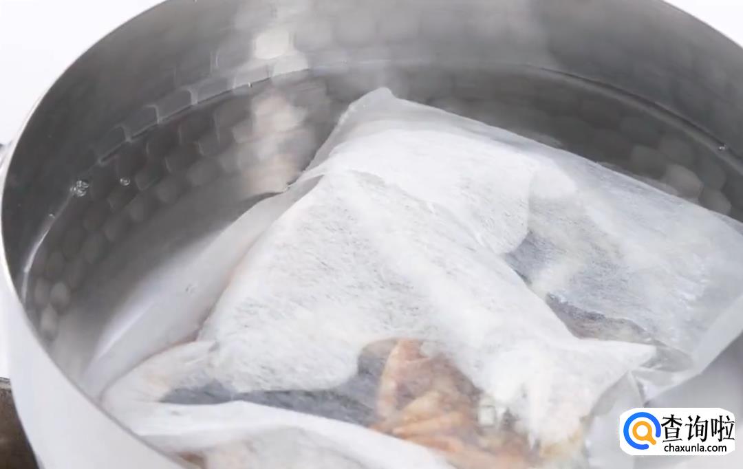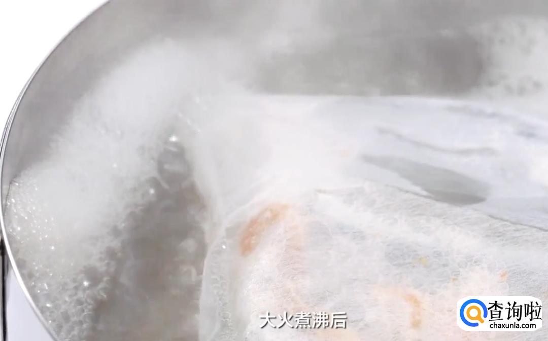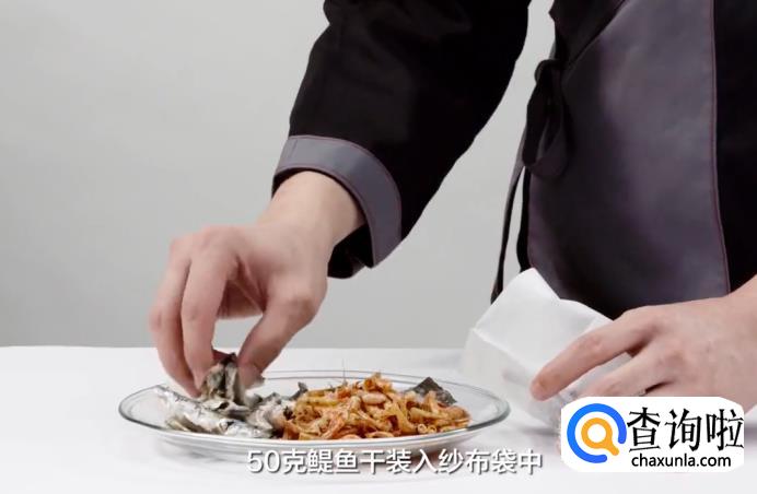 将10克干海带、50克干虾、50克鳀鱼干装入纱布袋中,放入1000毫升清水中大火煮沸。