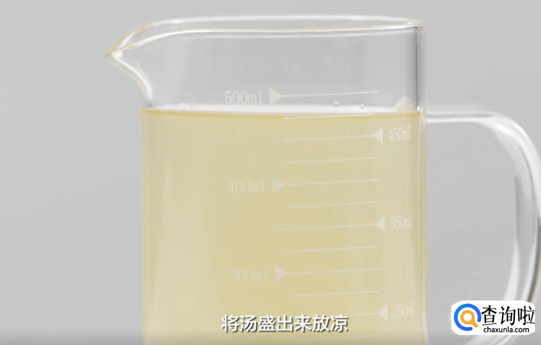 煮沸后转中火,再煮个十来分钟,关火;将汤盛出来放凉。