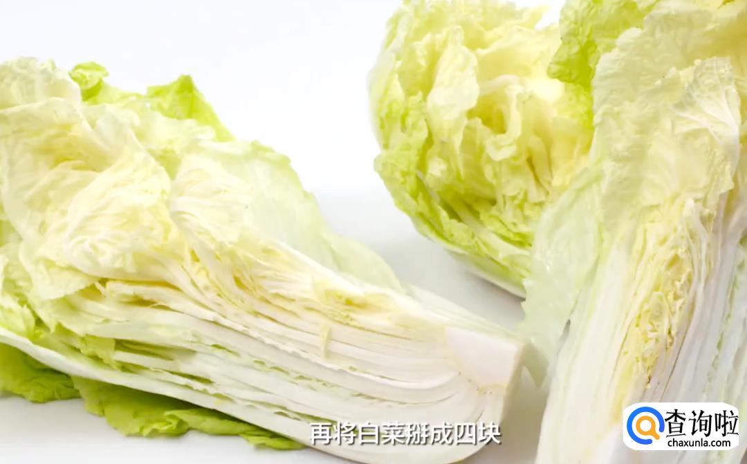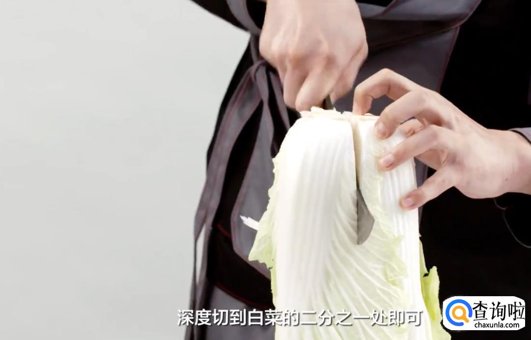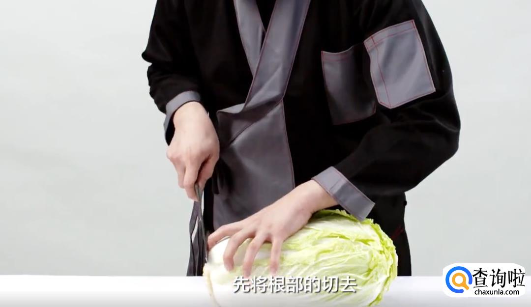 取一整颗大白菜,先将其根部切掉,再从根部往下切十字刀,深度切到白菜的二分之一处即可;再将白菜沿着十字刀口掰成四块。