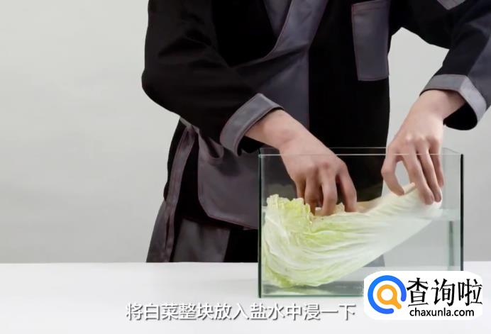 白菜要先用盐水浸渍:我们按水和盐10:1的比例调一个盐水,将白菜整块放入盐水中浸一下后取出。