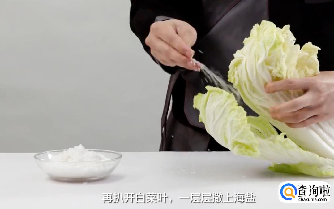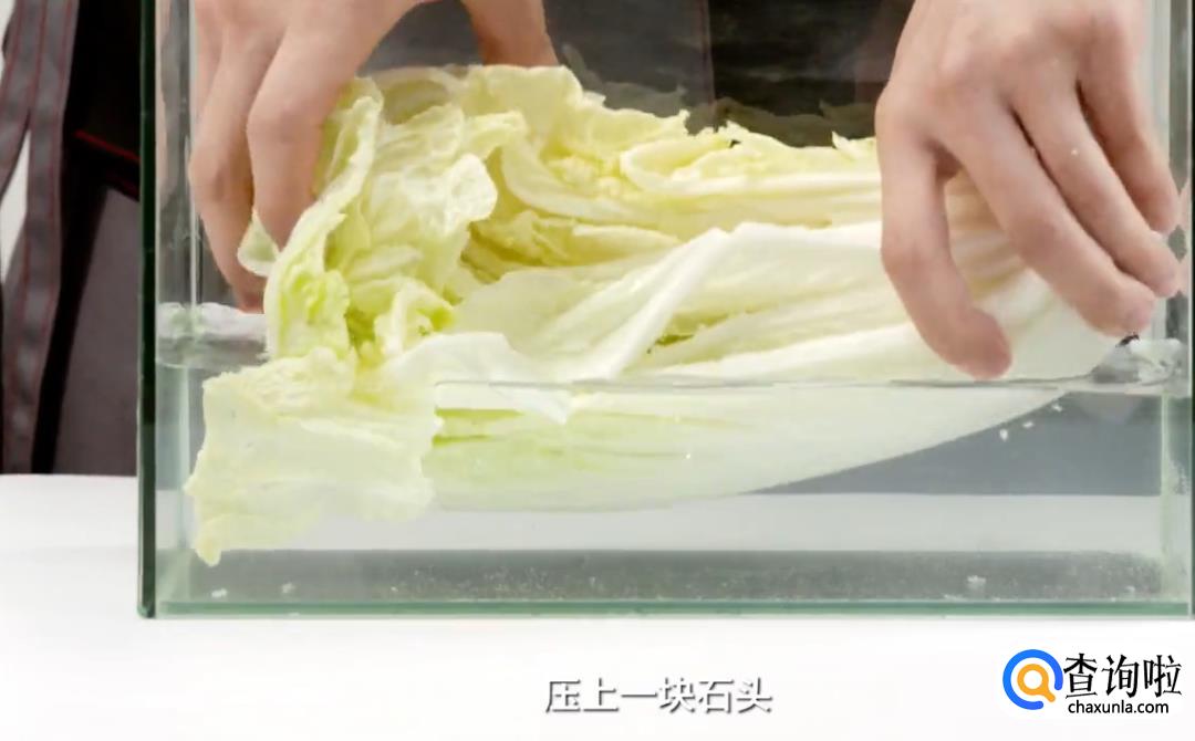 扒开白菜叶,一层层撒上海盐;然后将白菜再放回盐水中,压上一块石头,浸泡8个小时左右。
