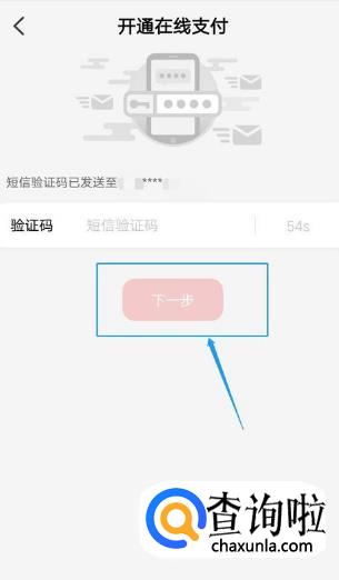 在“开通在线支付”页面,输入短信验证码,然后点击“下一步”即可。