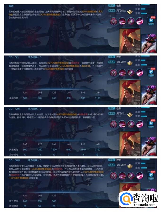 方天画斩:吕布的核心伤害技能,每攻击一个英雄回复自身已损失生命6%,最多回复24%,对付高护甲坦克时效果很不错。