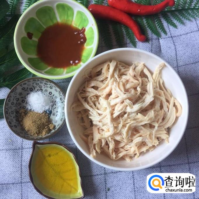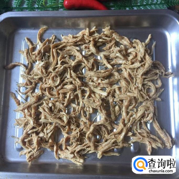 然后把鸡胸肉捞到冰水里面浸泡十分钟,捞出撕成条,如下图所示。