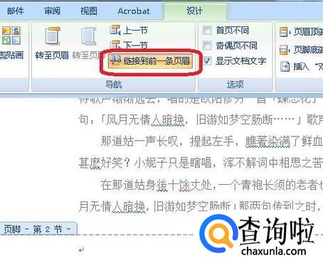 此时光标会自动移到下一页开头,我们双击光标所在页的页脚区域,进入编辑状态,如图所示,点击工具栏“链接到前一页页眉”按钮(注意:没有点击前该按钮有黄色底纹,点击之后底纹消失)。