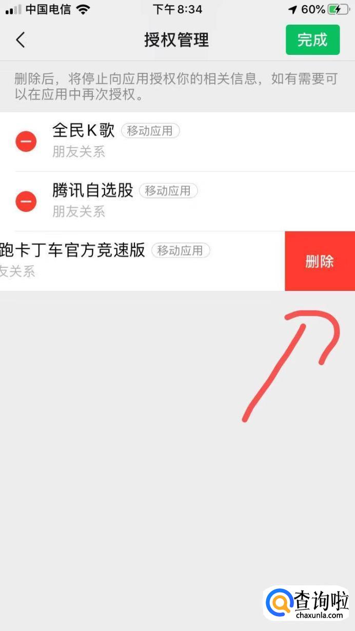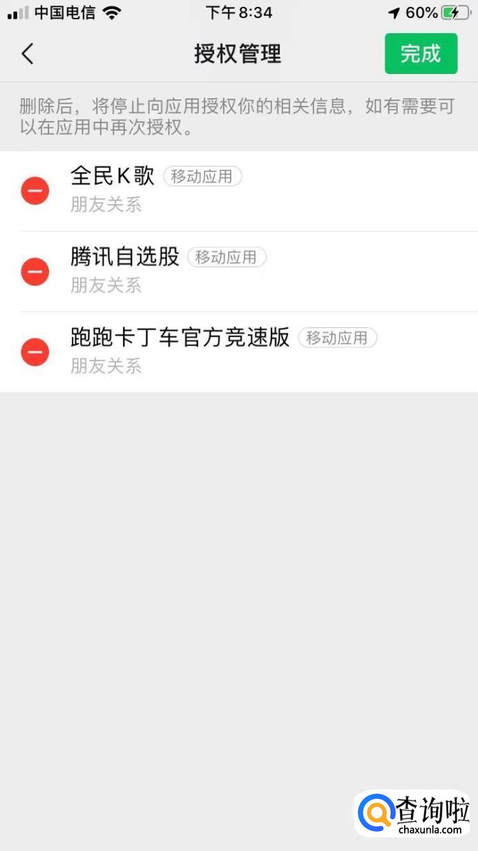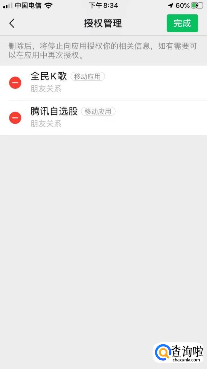 如果你想解除某个绑定的应用,点击那个红色的减号按钮,就会出现”删除“,点击删除后,这个应用的授权就被解除啦,最后点击完成就行了。