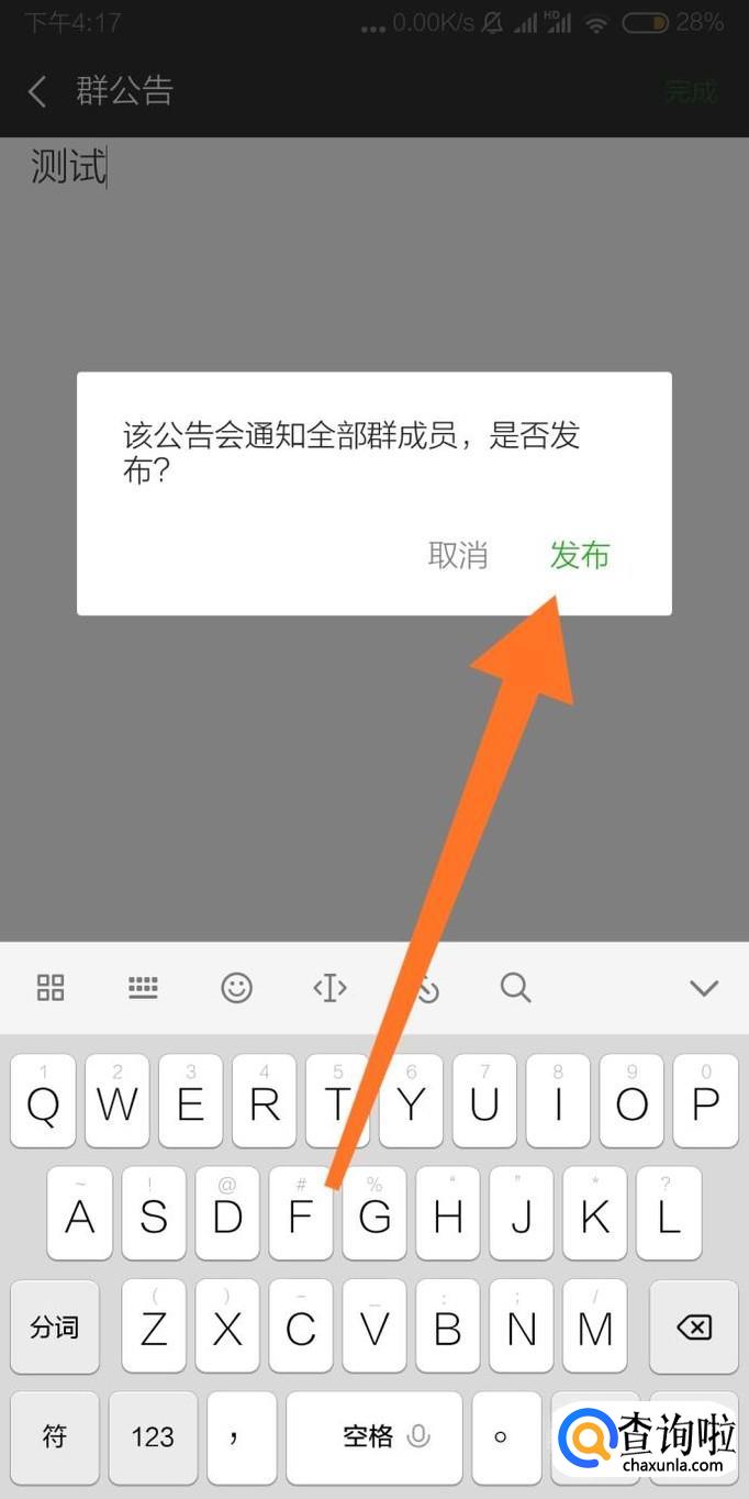 随便输入公告内容,然后点击右上角的“完成”按钮。