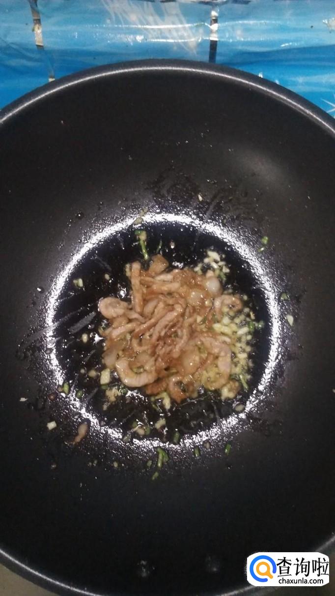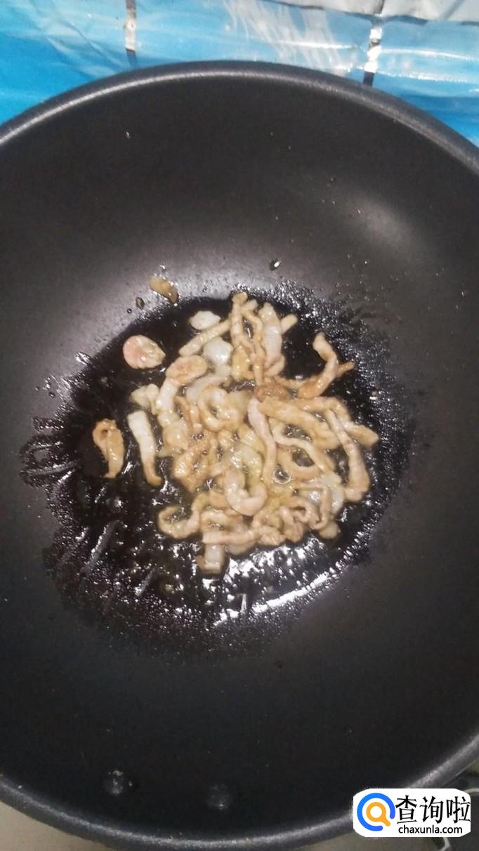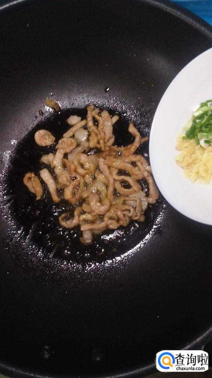 炒锅中放入适量油,油热后将肉丝放入锅中炒熟,将葱姜蒜切碎,然后,倒入锅中,和肉丝一起爆香。