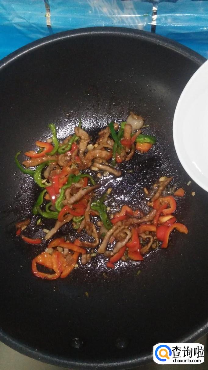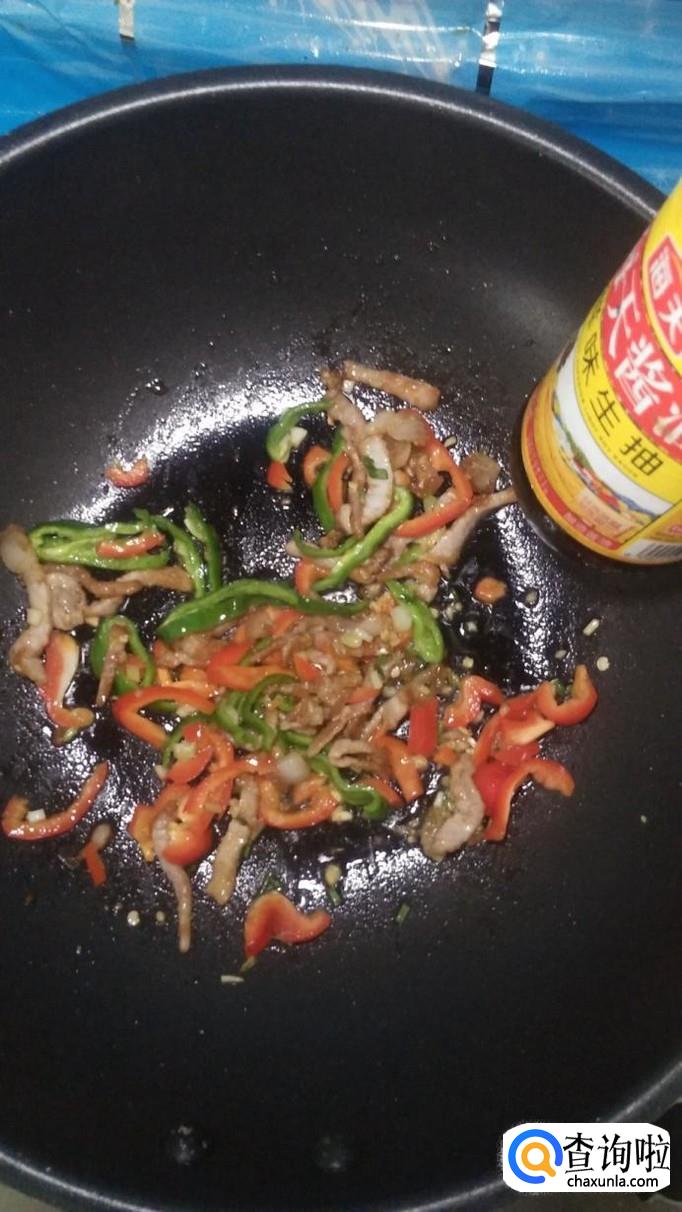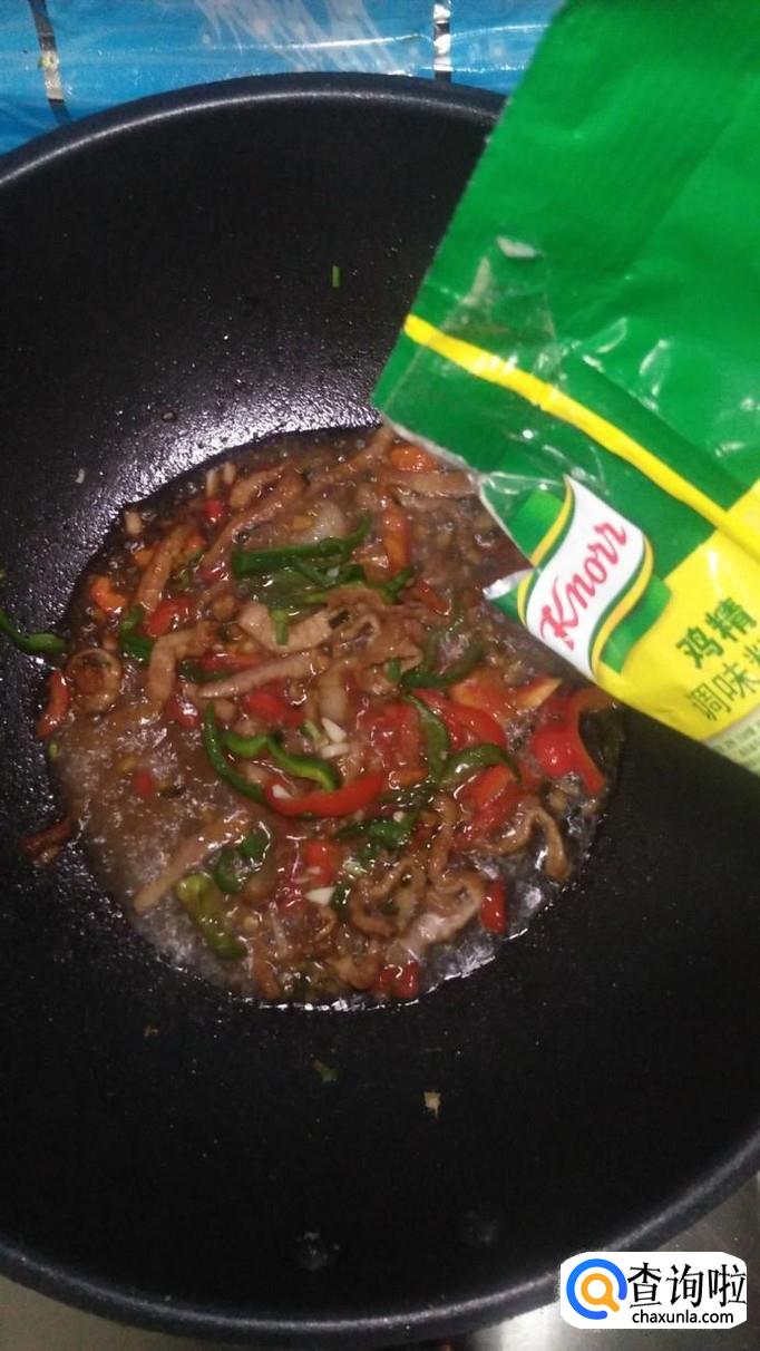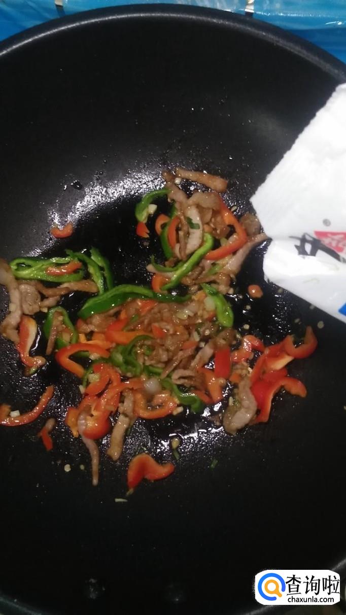 加少许清水,防止粘锅,出锅前加入少许鸡精提鲜,青椒炒肉丝就做好了。
