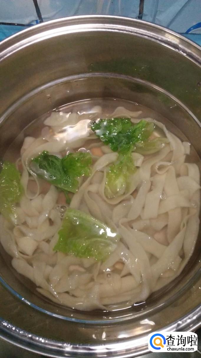 汤锅中烧开水,水开后,将做好的面条放入锅中,然后加少许生菜,和面条一起煮熟。