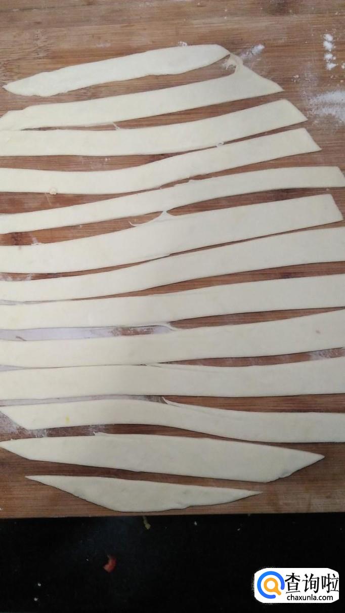 准备适量面粉,加清水和成光滑的面团儿,醒20分钟左右,醒的时间越久,做出来的面条越筋道。用擀面杖将面团擀成薄片,越薄越好,然后切成面条的形状。