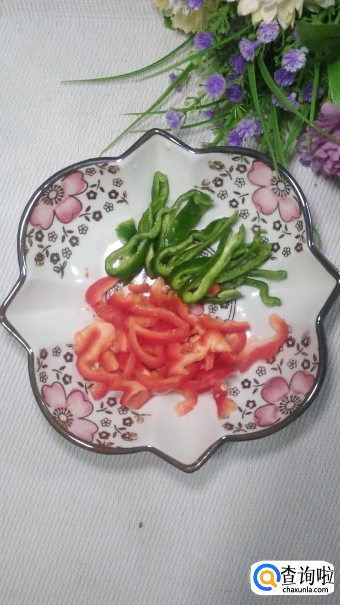 准备适量青红椒,洗净后切成丝,放入盘中备用。