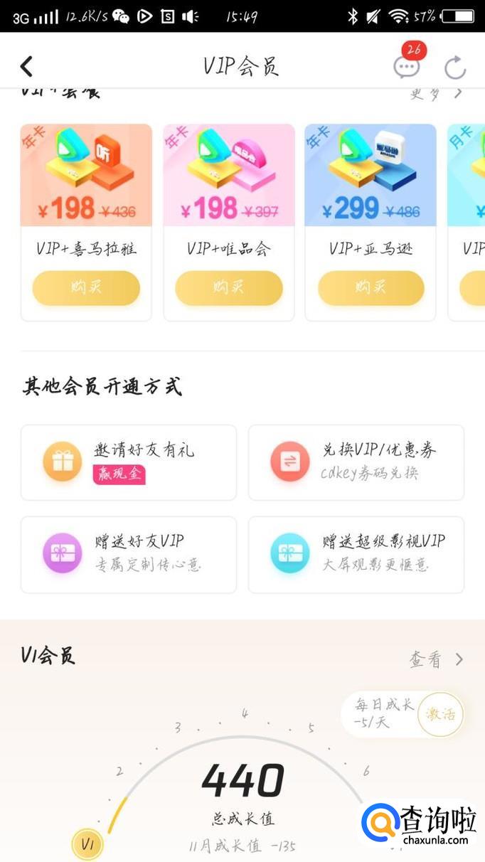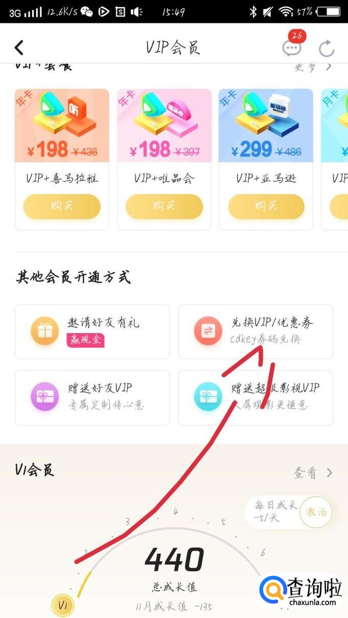 向下滑动手机,点击“兑换VIP”选项,如图1箭头所示。你会看到出现一个新的界面,如图2所示。这样你就可以激活你的兑换码了。