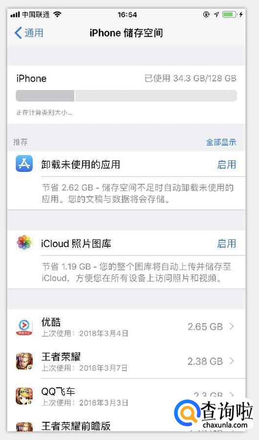 我们点击设置-通用-iphone储存空间,然后就就可以查看本机的空间使用情况,我们可以卸载不经常使用的APP和一些照片可以起到一定的清理内存作用。