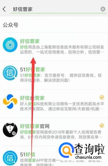 在搜索结果页面,点击好信管家进入并关注,如图所示。