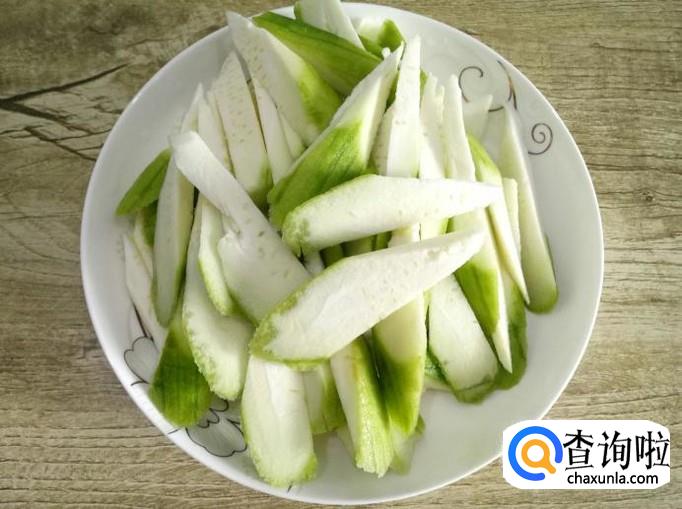 丝瓜洗净,用小刀轻轻刮去表面那层深色皮,再次清洗一次,然后斜滚刀切块备用。