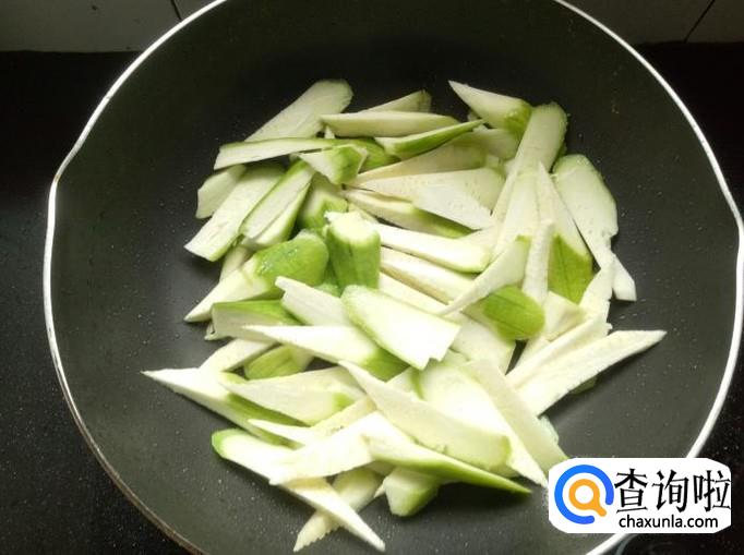 锅烧至七成热放入适量食用油,放入备好的丝瓜翻炒两分钟,然后加入适量的盐和鸡精翻炒。