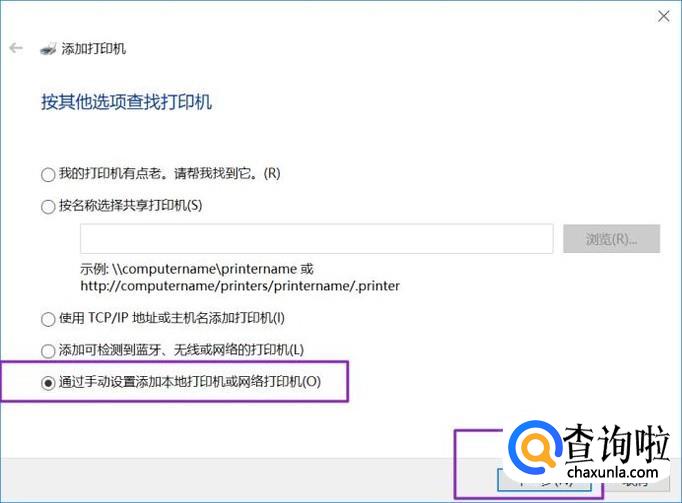 弹出的界面,我们选择通过手动设置添加本地打印机或网络打印机,然后点击下一步;
