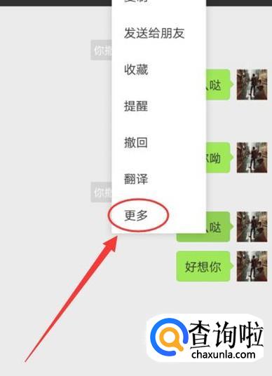 长按聊天记录,出来一个菜单栏,点击“更多”,如图所示。