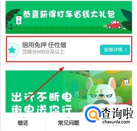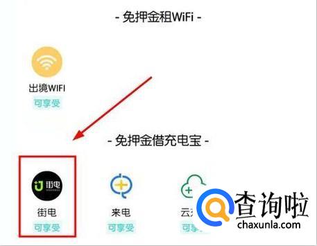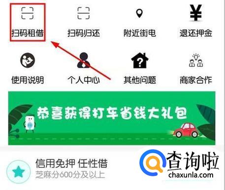 点击以后会跳转到街电服务的主页,我们在该页面的中间位置有显示芝麻分600分以上可免押金的提示;如果我们的芝麻分达到了,那么点击该页面左上角的"扫码租借"即可;