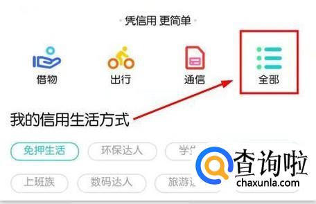 进入到芝麻信用以后,我们点击其中的"信用生活",然后再点击“全部”,即可在所有信用生活分类里面找到"街电"服务了,如下图;