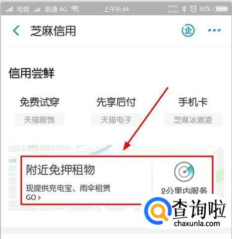 以上方法适用于我们知道哪些地方有街电服务窗口,如果我们对目前的位置比较陌生,那么如何借用充电宝呢?返回到芝麻信用首页,找到"附近免押租物",然后地图上显示绿色电池图标的就是网点的分布图;
