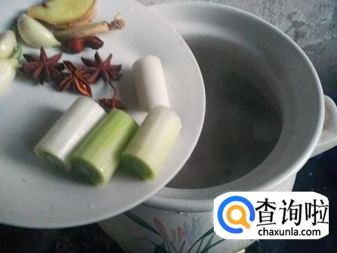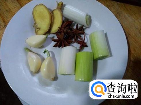 在等待水开的同时,我们葱切成段,姜切成片和蒜及八角放在一起备用。