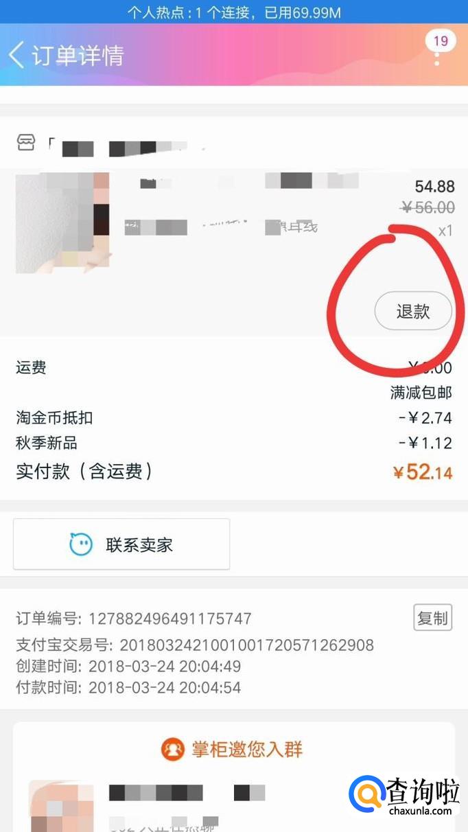 进入"待收货"界面,点开购买的商品的详情页,然后点击界面中间的"退款"。