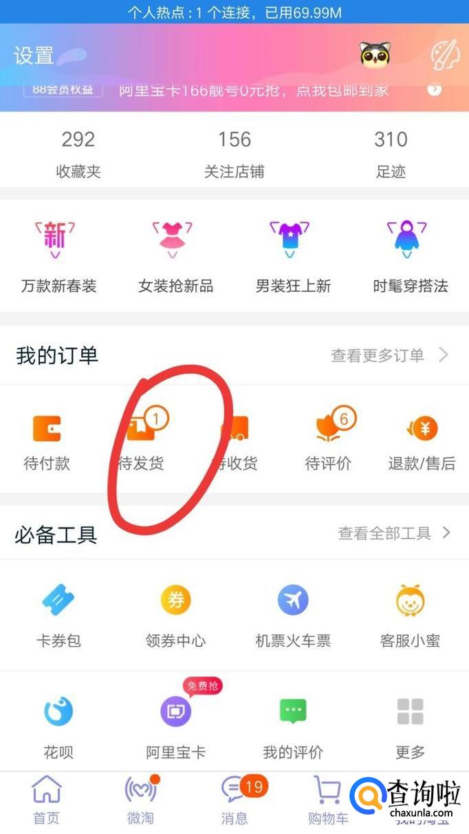 进入淘宝后,点击界面左下角的"我的",然后点击界面中间的"待发货",如果卖家已经发货了,那就点击"待收货"。